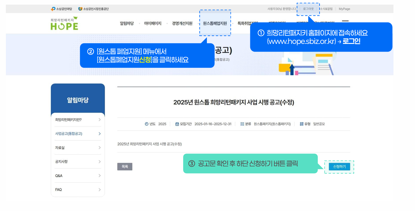 ‘희망리턴패키지 원스톱폐업지원’ (해당 공고문 사이트)